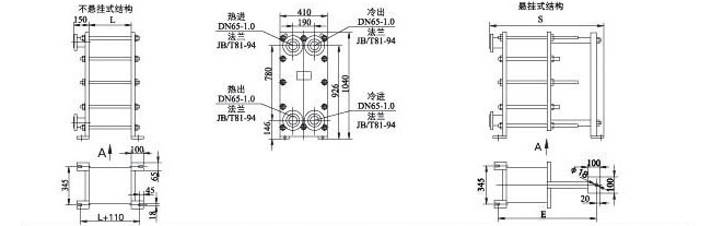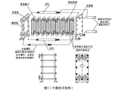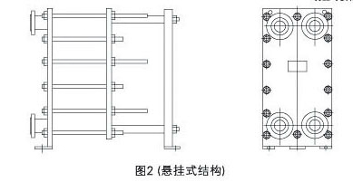 板式換熱器在裝配形式上又可分為不懸掛式(圖1)和懸掛式(圖2),不懸掛式換熱器不帶支柱,地腳板直接焊在二個夾緊板的下端,它適于重量較小的小型號的換熱器,以便在拆裝時能搬動。懸掛式換熱器帶有支柱,它拆裝時可在有所原位不動,活動夾緊板和換熱板片懸掛在上導桿上,可以移動,換熱板片可以拆下和裝上,較大型號的換熱器一般采用懸掛式的,以便于拆裝維修。