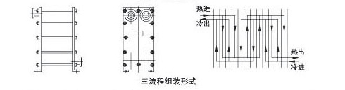 板式換熱器根據(jù)介質的溫差和流量,可以裝配成單流程、雙流程、三流程以及多流程的形式,單流程是指介質在換熱器內流過一個流程,雙流程是指介質在換熱器內折返流過兩個過程,依次類推,各種流程的外形圖和其流程示意圖如圖三。單流程時接口可以都在前面的夾緊板上,也可以不都在前面的夾緊板上,當采用多流程時,換熱器的四個接口就不能在同一側的夾緊板上,進出口要位于前后兩個夾緊板上。