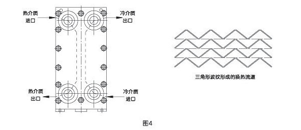 BR型的特點是,換熱板片和密封膠墊都是相同的,板片上四個流道孔的大小相同,同種介質在一側的兩個流道孔進出,不能形成對角流動的形式,裝配時相鄰換熱板片調轉180°,使人字型方向相反。板片波紋截面形狀為三角形,裝配后兩流道的橫截流通面積相等。如圖4。
