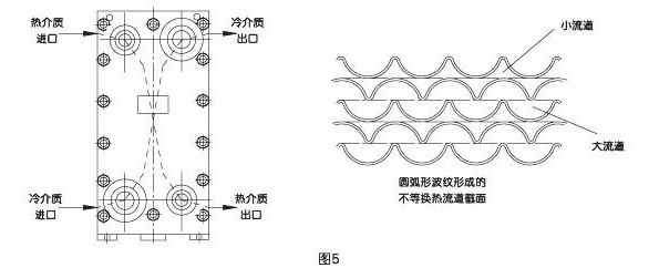 BRB 型的特點是,采用兩種不同的換熱板片和膠墊(俗稱 A 板 A 墊和 B 板 B 墊)。板片對角方位上是兩個大流道孔,另外對角方位是兩個小流道孔,同種介質在對角流道孔進出,不能在同側流道孔進出,如圖5。板片波紋截面形狀為圓弧形,兩種板片的圓弧形狀方向相反,裝配時兩種板片交替疊放,裝配后,由于兩種板片波紋截面弧狀彼此相反,對應大流道孔的板片波紋是圓弧里面相對,內腔形成較大的流道截面;而對應小流道孔的板片波紋是圓弧的背面,內腔形成小的流道截面,兩截面面積的比例大致為2:1,這就是 BRB 型不等流道截面的由來。