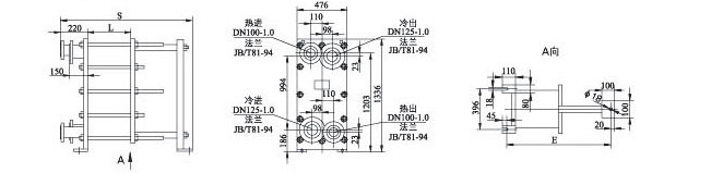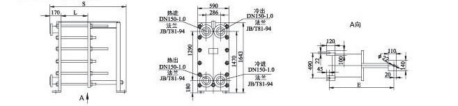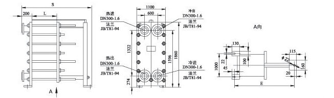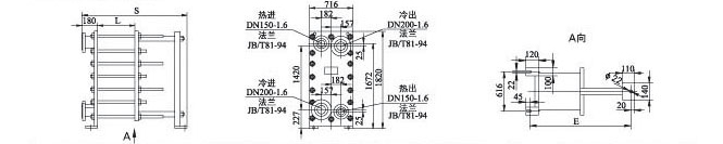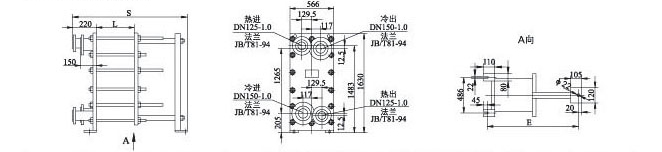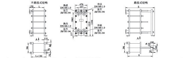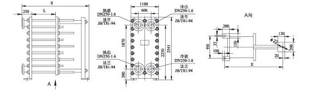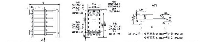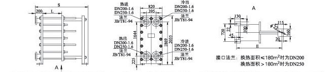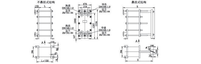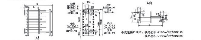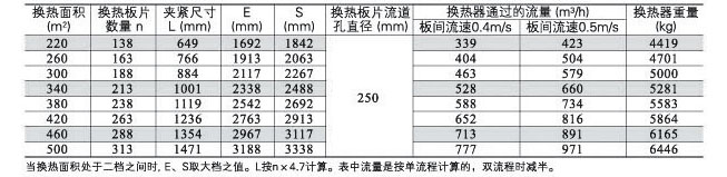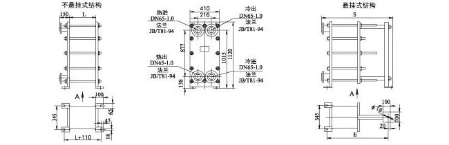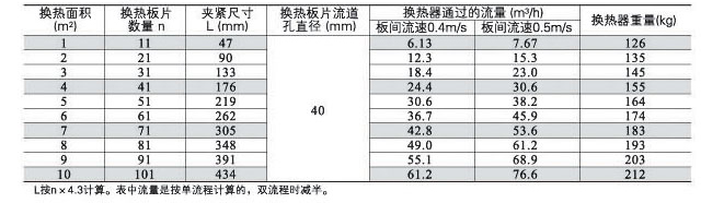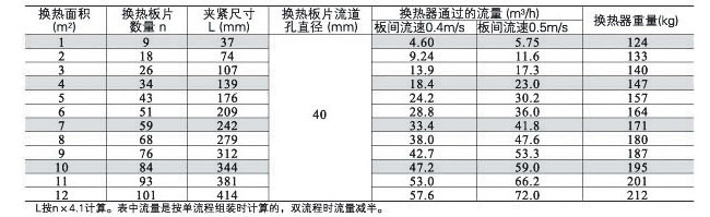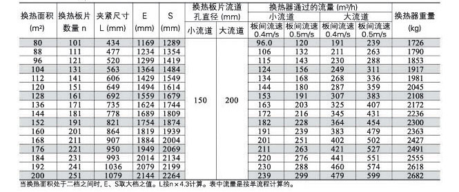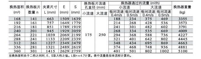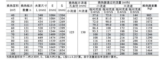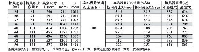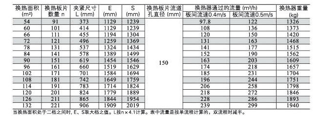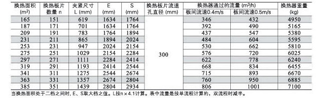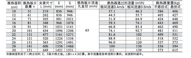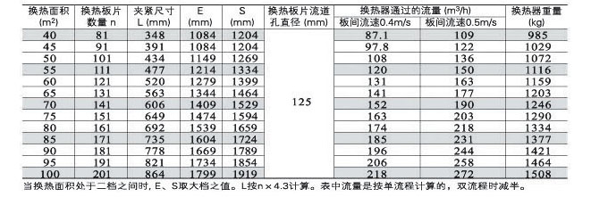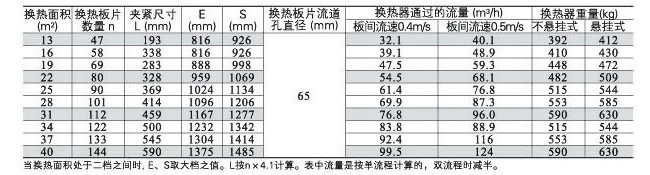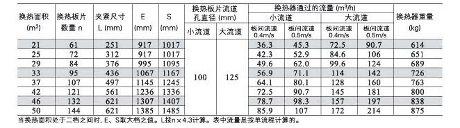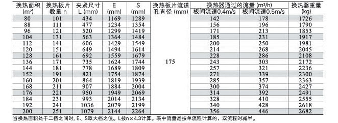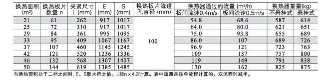 由于不同時期的產品參數(shù)可能有變化,因此下面參數(shù)表中的數(shù)據(jù)僅供參考。圖中接口法蘭大小為常規(guī)規(guī)格,如果流量較小時可以減少,但一般不能加大。表中都是以單流程組裝形式為例,也可裝成多流程形式。換熱面積也可以不按表中格擋數(shù)值而任意選取,當換熱面積位于表中二檔之間時,懸掛式的E、S尺寸要按下一檔的大檔之值確定,L尺寸要按表下面的算式算出。